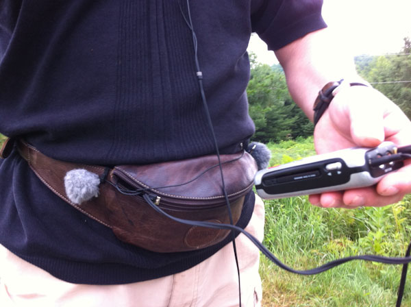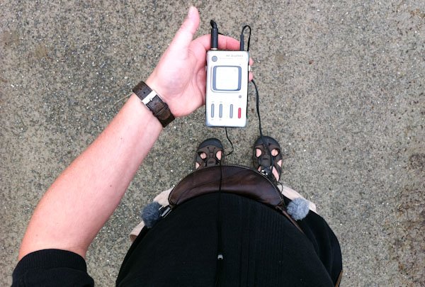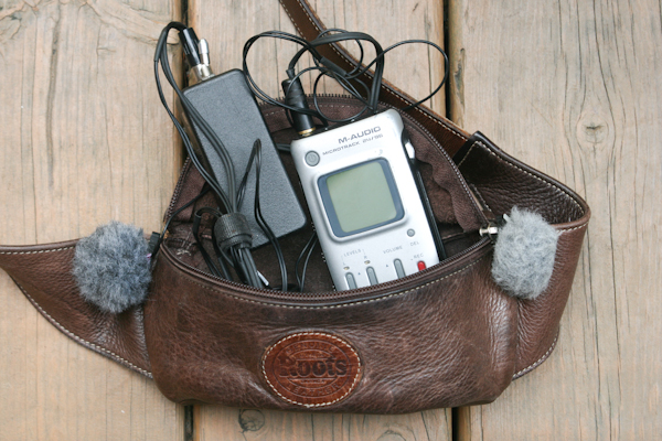 It consist’s of a pair of DPA 4060 omnidirectional microphones mounted and self powered by Core Sound battery box(here) and a M-Audio’s MicroTrack I. The mic preamps of the recorder are not the ideal, I have to say, but I usually don’t need to push them too much. It’s a gain in portability and discretion. All this comes in the bag. I can go almost anywhere. It is worn around my waist because I’d rather have the mobility of my head at all times. The Rycote’s and the mics are on both sides of the bag.